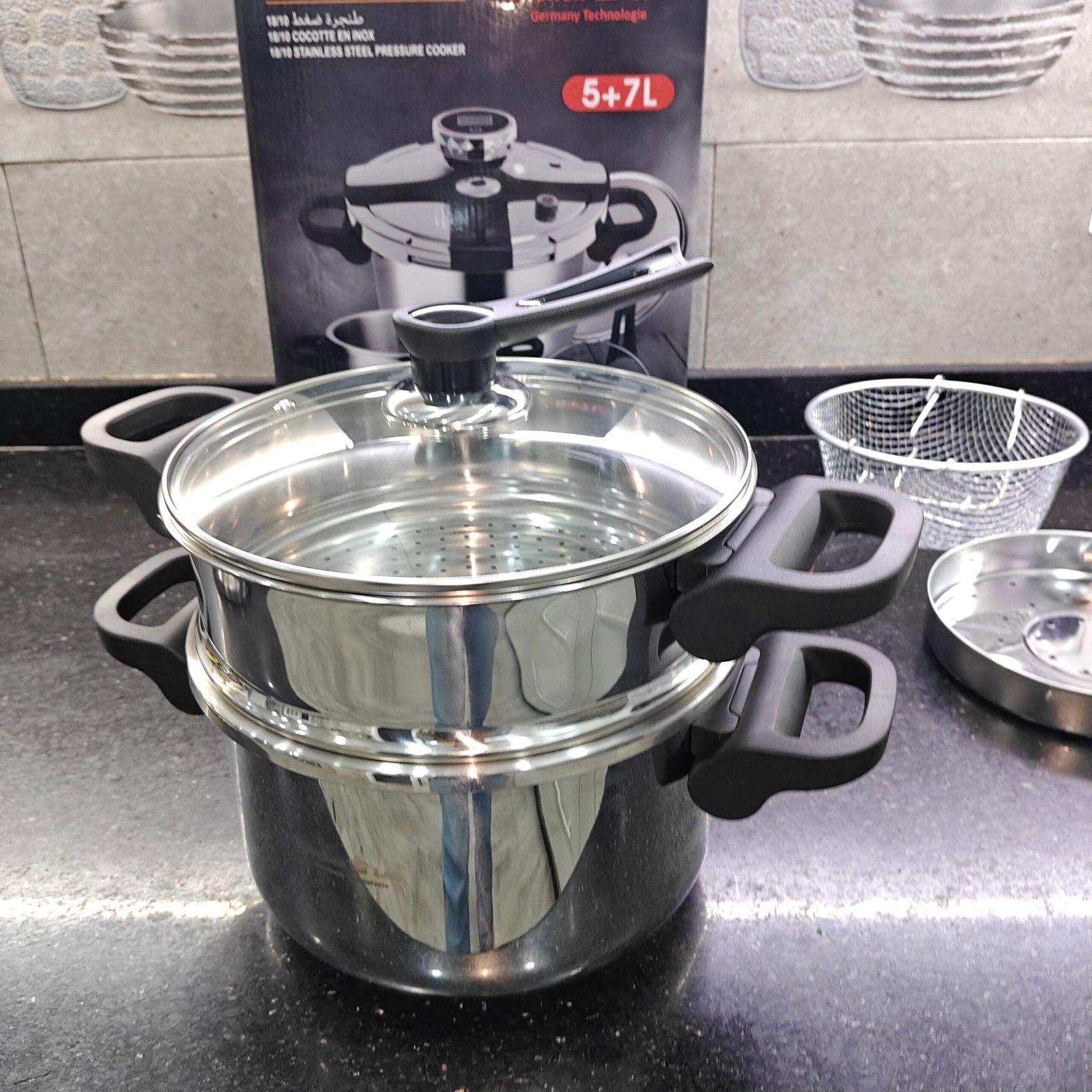 Pack cocotte minute 7 pieces multifonction d’une marque allemande 🇩🇪 contient cocotte 5 litre et cocotte 7 litre + couscousier 5 litre et couscousier 7 litre + friteuse + panier a vapeur pour légumes + minuteur 💯 inox haute qualité 18/10 certifiée et griffée avec poignée rabattable