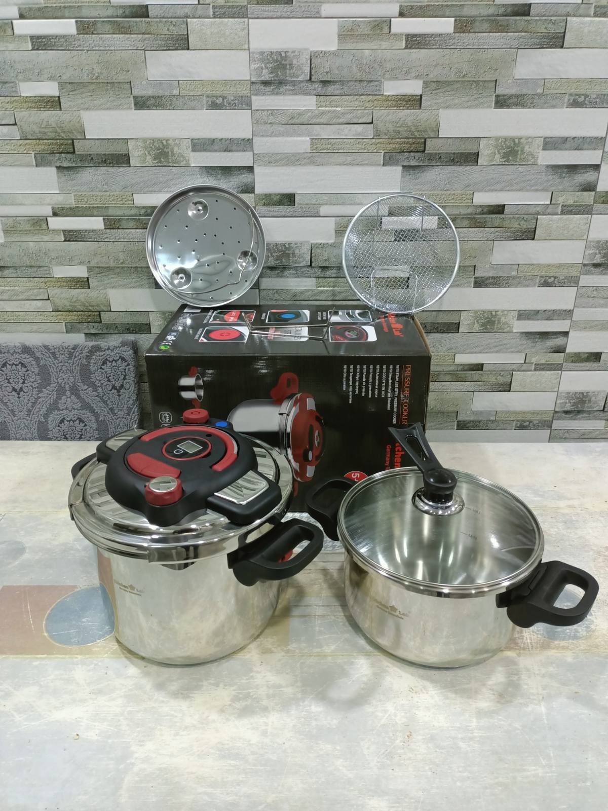 Ce set autocuiseur + faitout 5 en 1 en inox contribuent à une cuisson rapide et homogène des aliments ; avec une ouverture/Fermeture facile ; 3 niveaux de pression ; Sécurité par blocage automatique ; 3 niveaux de sécurité ; Inox 18/10 ; Compatible avec les feux à induction / Gas / électrique ; Polissage satiné à l’intérieur, miroir à l’extérieur ; Légumier et support légumier en inox ;Couvercle en verre.